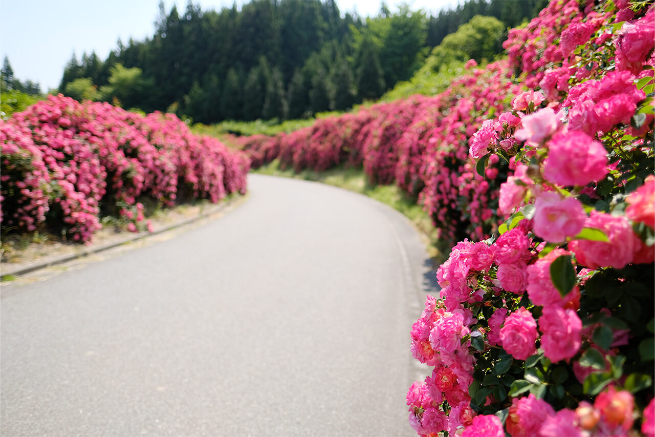 ピンクや赤に彩られたバラの壁が100mほど続く羽茂春風バラロードは、初夏の佐渡で訪れたいドライブスポット。地元の柿農家さんが道の景観を良くしようと、道路の両側にバラを植えたのが始まり。今では島内はもちろん、島外からも観光客が訪れるバラの名所に。駐車場はないため、立ち寄る際は周囲に配慮を。心地よい風を感じながら、初夏だけの華やかな佐渡の風景を楽しもう!