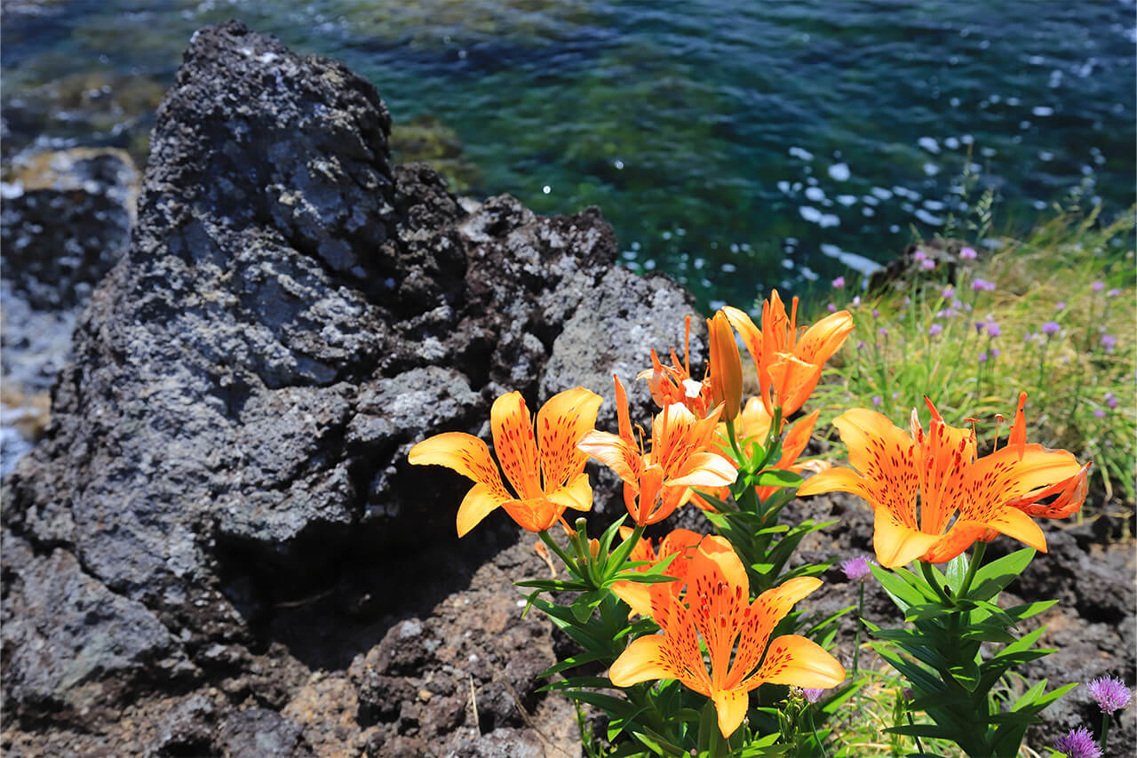 日本海側の岩場に自生することから名づけられた岩百合(イワユリ)は、5月下旬から6月頃に見頃を迎える初夏の花。藻浦崎公園では、岩場から芝生へと広がるオレンジ色の群生を間近に見ることができる。龍金岩と呼ばれる岩場には、海上安全と豊漁を願う龍王大明神が祀られている。朱色の鳥居とオレンジ色の花、青い海が織りなす鮮やかなコントラストが夏の佐渡を彩る。